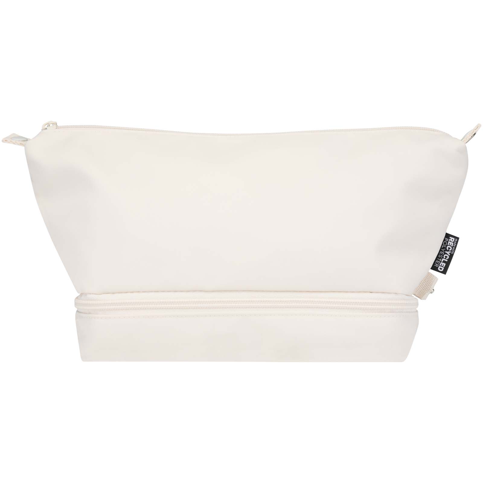 The Trip Aware™ recycled travel toiletry bag is a compact, structured bag designed to keep personal items neatly organised while travelling. Made from 290D twill polyester with a knitted backing and lined with RPET 210D/PU, it features a clean layout with practical compartments. The main compartment includes an internal zip pocket for smaller items, while the clamshell-style bottom compartment keeps essentials separate for easier access and improved organisation. Each bag also comes with an Aware™ tracer. This innovative feature allows users to trace the origins and journey of their item through a QR code, enhancing transparency in the supply chain and fostering a stronger connection between the product and its production process. Volume capacity: 6 litres.