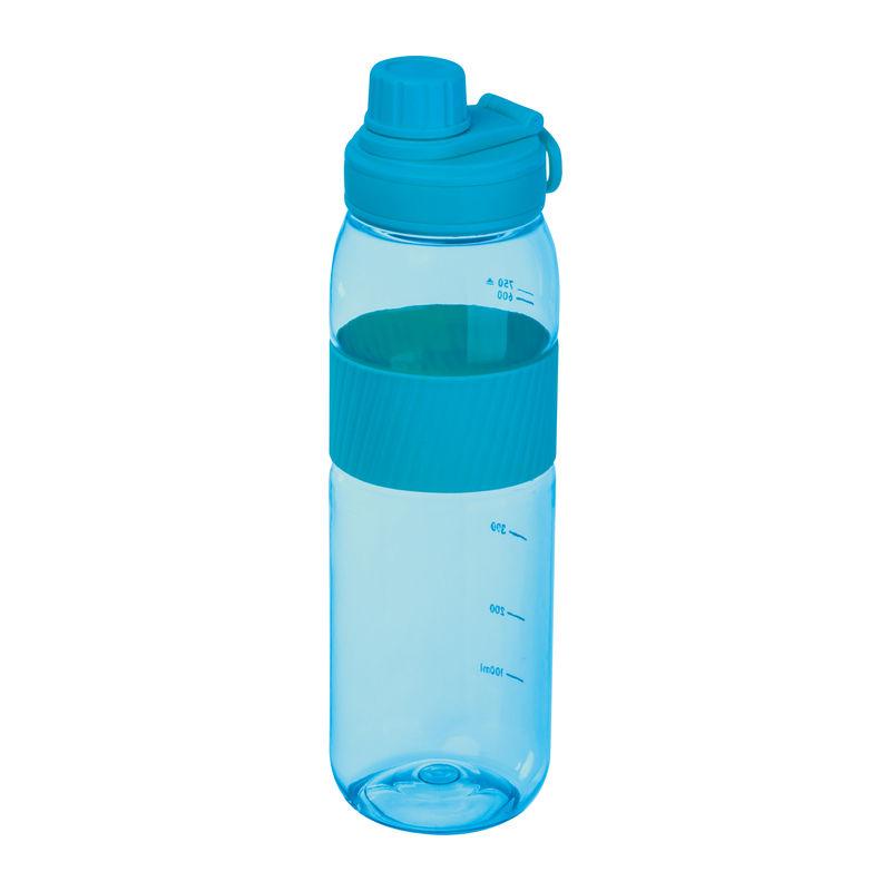 Tritan drinking bottle with screw cap, non-slip silicone grip zone, and 750ml capacity.