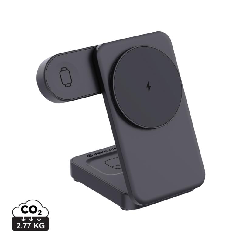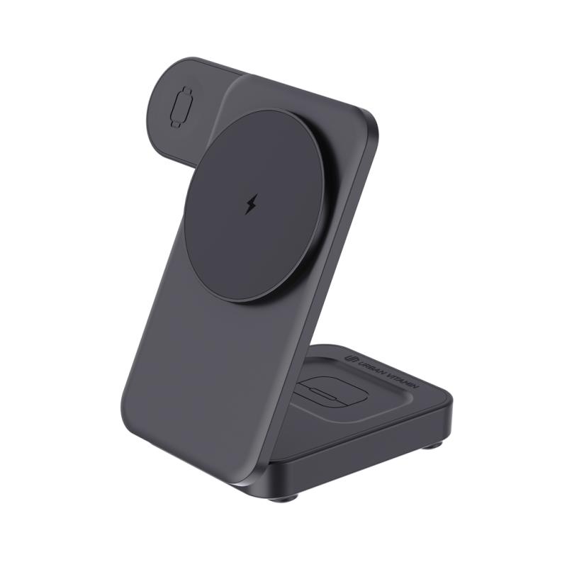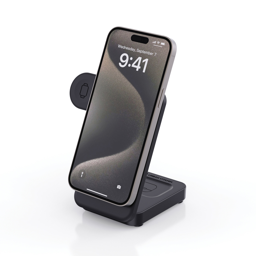 Need to charge all your devices at the same time at full speed? Arcadia has got you covered with its ultra-fast 15W magnetic charger. This compact wireless charger can be used on your desk, night stand but is also very easy to fold it up to bring on the go on your travels. Use it as a stand to charge magnetic charging phones The back has a 5W charging pad that lets you charge a second phone or earbuds. To top it off, use the watch charger to power the latest generations of iWatch. Arcadia comes with a 120cm recycled TPE cable for easy setup anywhere you want it. Simply connect it to a fast-charging power source (minimum 9V/2A) to get started. It’s made with RCS (Recycled Claim Standard) certified recycled ABS, with 34% recycled content based on total item weight. Urban Vitamin items are made without PVC and packed in plastic-reduced packaging.