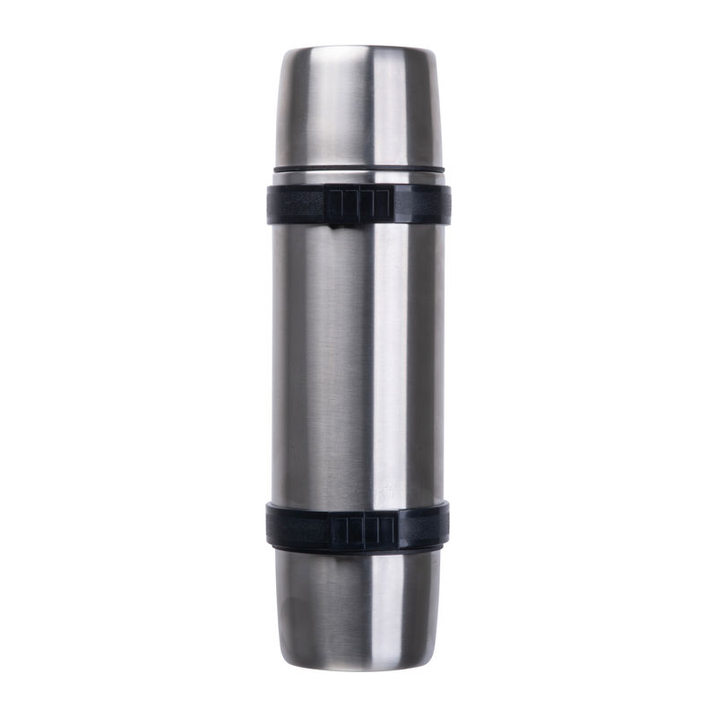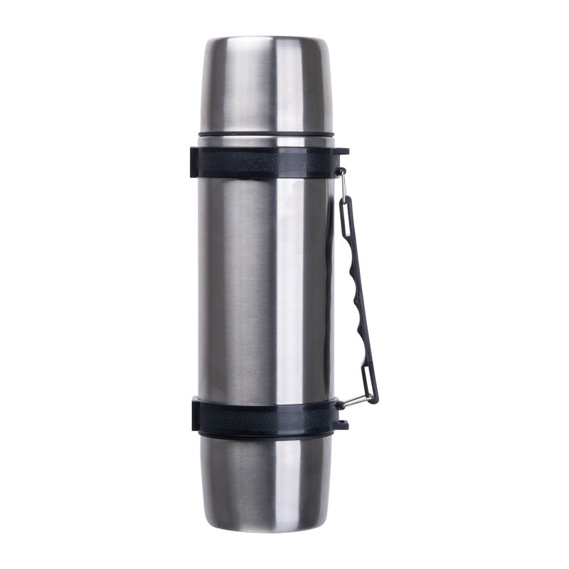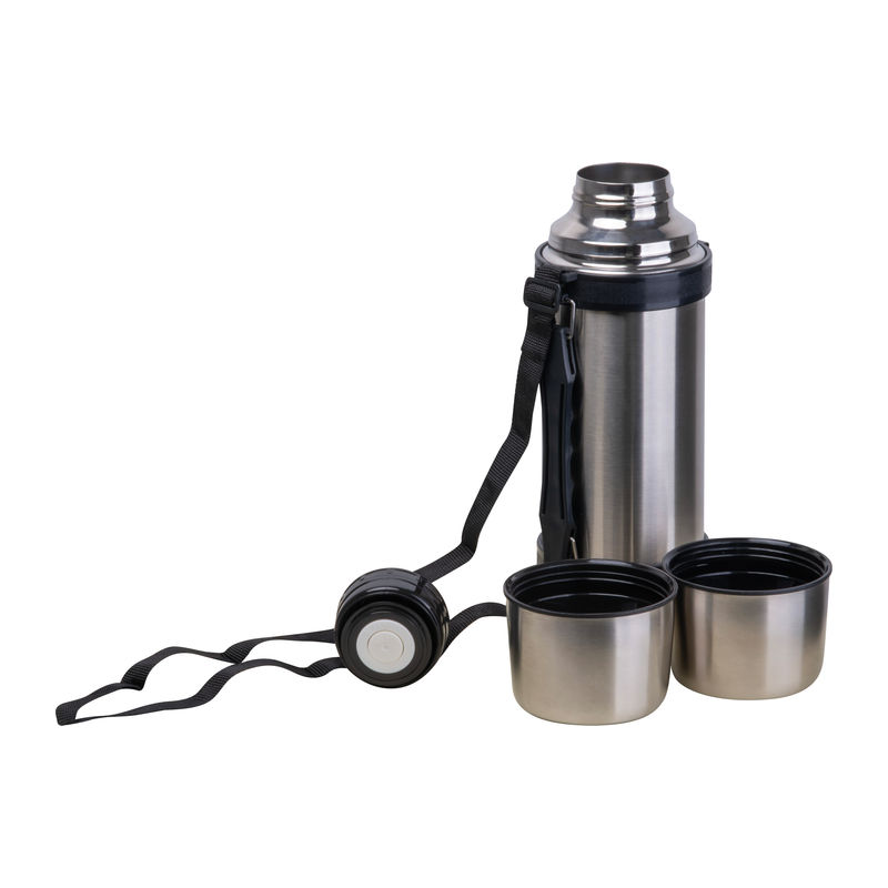 Robust 1000 ml vacuum insulated stainless steel flask with carrying strap and two integrated cups, ideal for on the go.