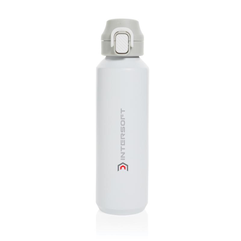 The Via RCS bottle is made from certified recycled 304 steel. This waterbottle features single-wall construction with a unique screw-on and lockable leak-resistant lid. Single hand operation. Press to open the lid for easy sip. Can be used for cold drinks only. Hand wash only. Made with RCS (Recycled Claim Standard) certified recycled materials. RCS certification ensures a completely certified supply chain of the recycled materials. Total recycled content: 73% based on total item weight. BPA free. Bulk packed. 600 ml. capacity