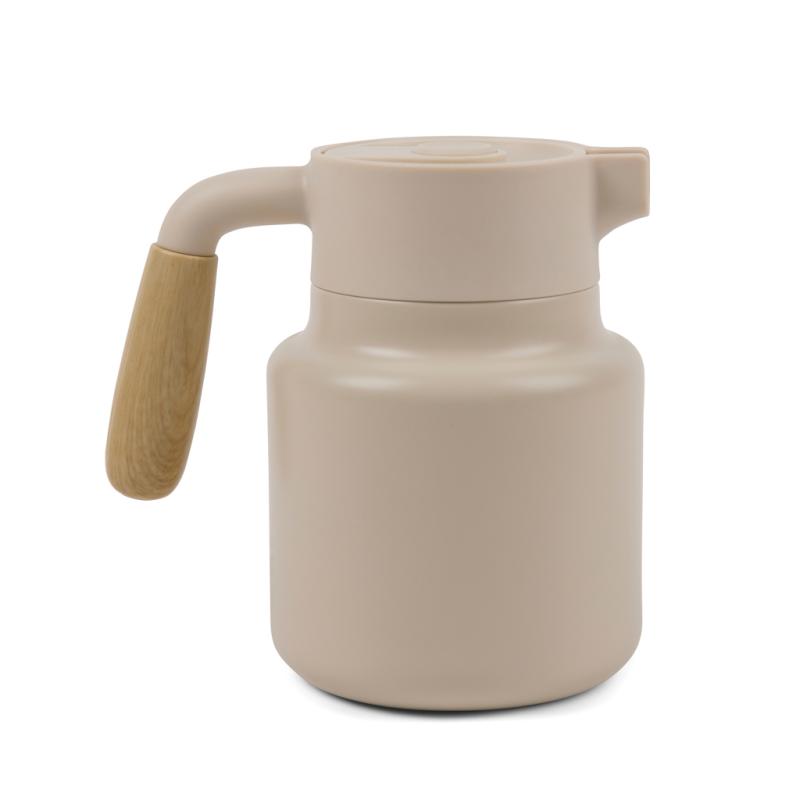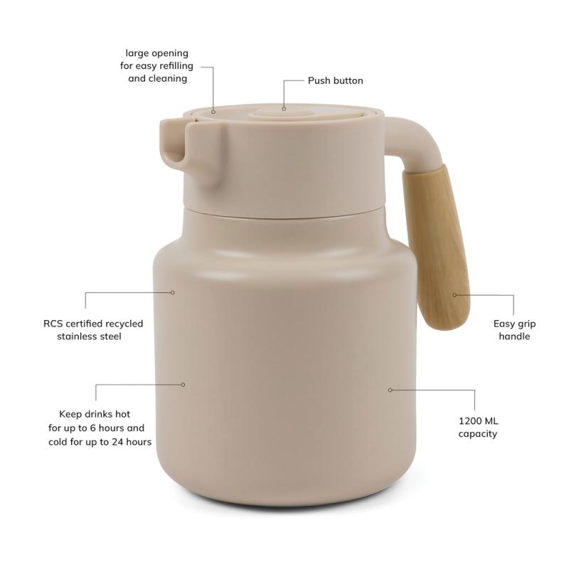 Keep your beverage warm or cold with this stylish vacuum jug made from RCS certified recycled stainless steel. With a capacity of 1200 ML. Both functional and elegantly designed, it complements any table setting. The lid features a convenient push button with a large opening for easy refilling and cleaning. The handle made from PP has an natural wood-like appearance. Easy to grip and pour from. This vacuum jug can keep drinks hot for up to 6 hours and cold for up to 24 hours. Handwash only. Not microwave safe. Certified by RCS (Recycled Claim Standard), RCS certification guarantees that the entire supply chain of recycled materials is certified. The total recycled content is based on the overall product weight. This product contains 62% RCS certified recycled stainless steel.