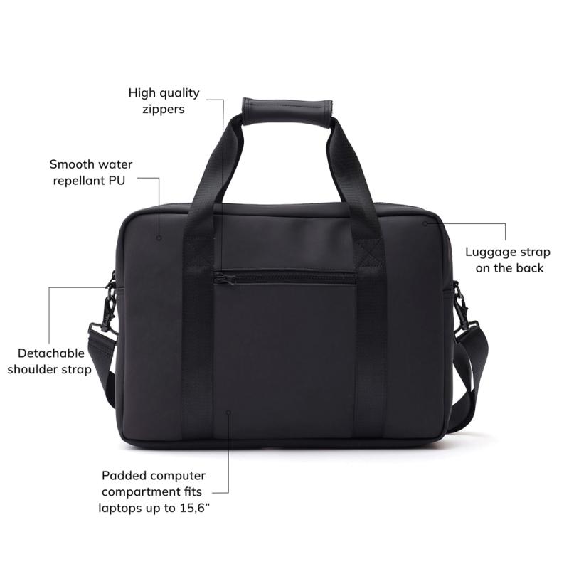 Modern and clean design computerbag. Functions and form comes together, besides the ordinary computer pocket this bag also has place for pens, documents and other belongings. The bag is produced in a water repellent material, with both shoulder strap and carry handles. It also includes an attached band on the backside, so it fits your trolley when travelling.Suitable for computers with an overall size of 17 inches. Please note that the dimensions of the display are not the same as the dimensions of the entire computer.