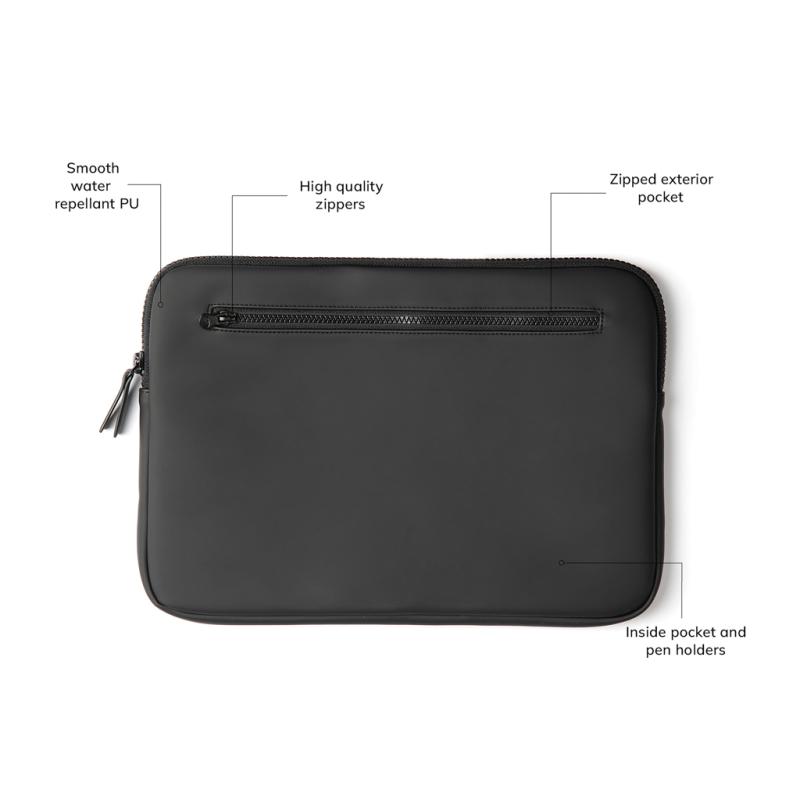 A stylish laptop case to protect your computer from bumps and moisture. Made in a light, water-repellent nubuck PU fabric with an elegant matt exterior and a light synthetic cloth interior. Suitable for computers with an overall size of 14 inches. Please note that the dimensions of the display are not the same as the dimensions of the entire computer.