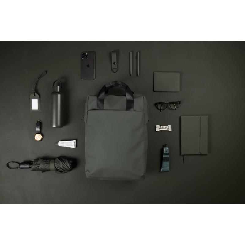 An easy-to-handle bag with a sleek design. Carry it as a tote bag or a backpack. The bag features a wide zippered opening for convenient packing of your laptop and other valuables. A strap on the back allows it to be attached to a trolley for smooth travel. It also includes a large front pocket, an inner pocket, and a practical bottle holder. Certified by RCS (Recycled Claim Standard), RCS certification guarantees that the entire supply chain of recycled materials is certified. The total recycled content is based on the overall product weight. This product contains 19% RCS certified recycled polyester.