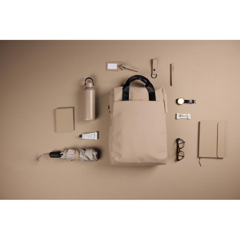 An easy-to-handle bag with a sleek design. Carry it as a tote bag or a backpack. The bag features a wide zippered opening for convenient packing of your laptop and other valuables. A strap on the back allows it to be attached to a trolley for smooth travel. It also includes a large front pocket, an inner pocket, and a practical bottle holder. Certified by RCS (Recycled Claim Standard), RCS certification guarantees that the entire supply chain of recycled materials is certified. The total recycled content is based on the overall product weight. This product contains 19% RCS certified recycled polyester.