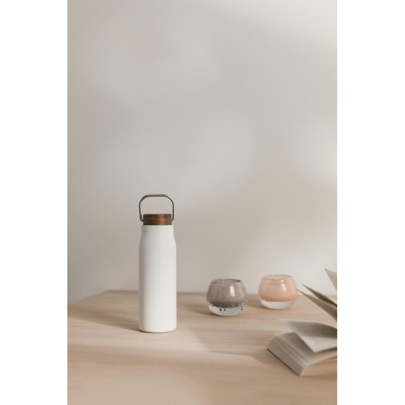 Ciro RCS recycled vacuum bottle is an elegant and functionally designed thermos bottle. The bottle has a lid of acacia wood with a metal loop, which makes the bottle easy to carry with you when you're on the go. Acacia wood is an organic material where variations in shade and color are natural characteristics. The vacuum construction with double walls in recycled stainless steel ensures that the bottle keeps the temperature intact for a long time, both hot and cold drinks. Certified by RCS (Recycled Claim Standard), RCS certification guarantees that the entire supply chain of the recycled materials is certified. The total recycled content is based on the overall product weight. This product contains 69% RCS-certified recycled stainless steel. The bottle is easy to clean and should only be cleaned by hand. Including FSC®-certified kraft packaging.