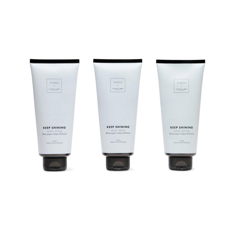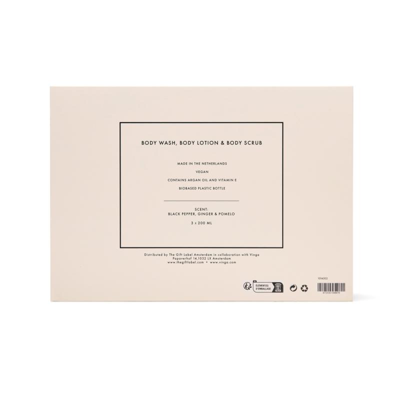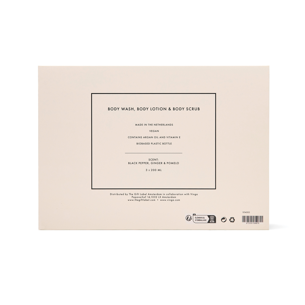 Lets turn every shower or bath into a luxurious ritual. This 3-piece unisex set includes 200 ml tubes of body wash, body scrub and body lotion, crafted to nourish your skin from head to toe. Infused with the warm, zesty aroma of black pepper, ginger and pomelo it leaves your skin feeling smooth, refreshed and subtly fragranced. Elegantly packed in a giftbox in cream white and black.