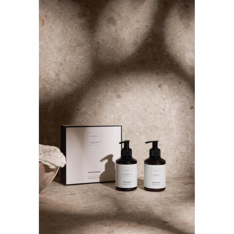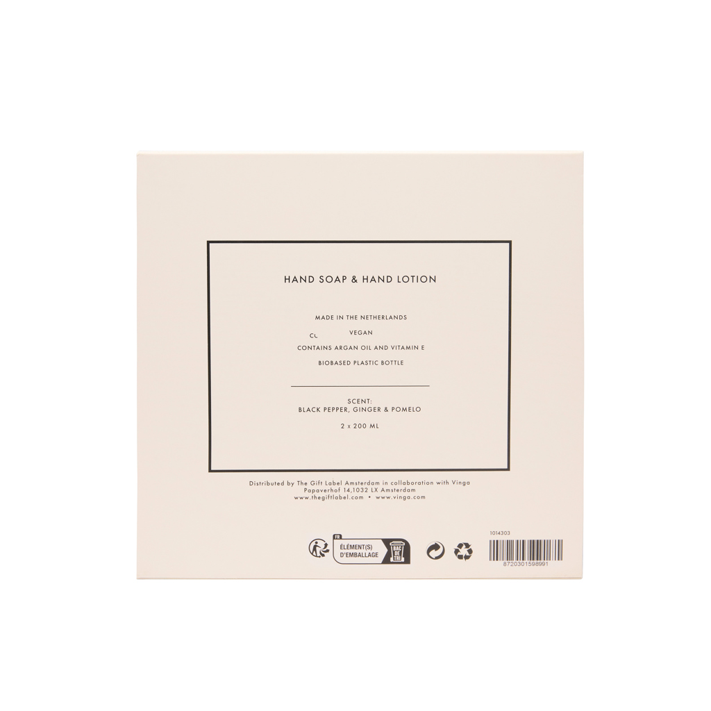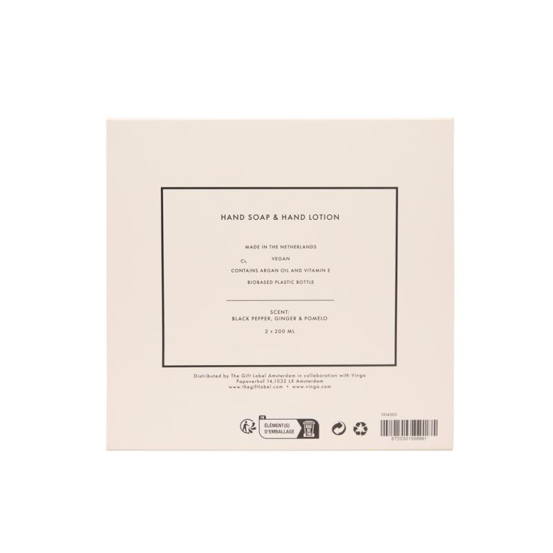 Silky smooth hands, every day. Take care of your hands with this beautifully scented unisex set, featuring two 200 ml bottles of hand soap and hand lotion. With the warm, zesty aroma of black pepper, ginger and pomelo it leaves your hands feeling smooth, nourished and subtly fragranced. A touch people will remember. Elegantly packed in a giftbox in cream white and black.