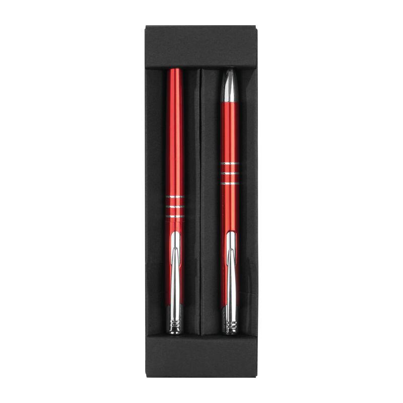 Aluminium wrtiting set, with 1 blue-writing ball pen and 1 rollerball. We will engrave your logo to the right of the clip. Laser costs are for both pens.