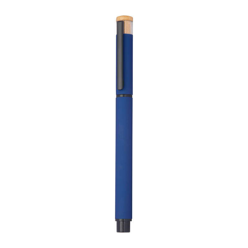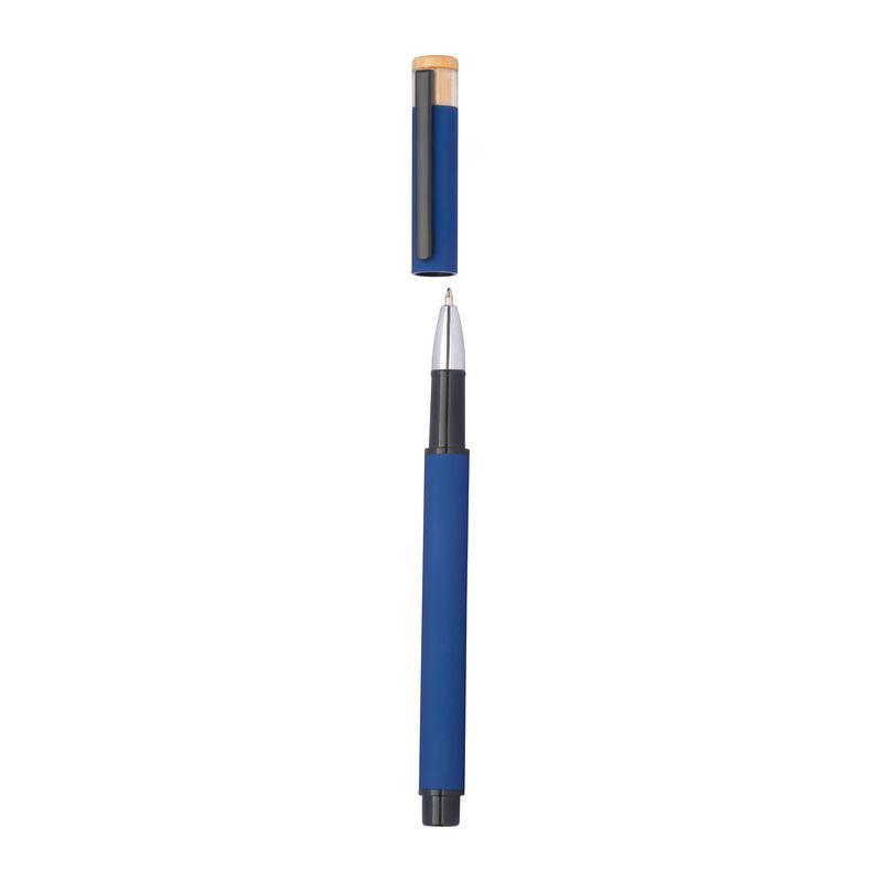 Writing set consisting of a ball pen with blue writing semi-gel refill and a rollerball made of recycled aluminium, with metal clip and bamboo pusher in an environmentally friendly box. Your logo will be engraved on both writing instruments to the right of the clip. (Engraving price for both writing instruments)
