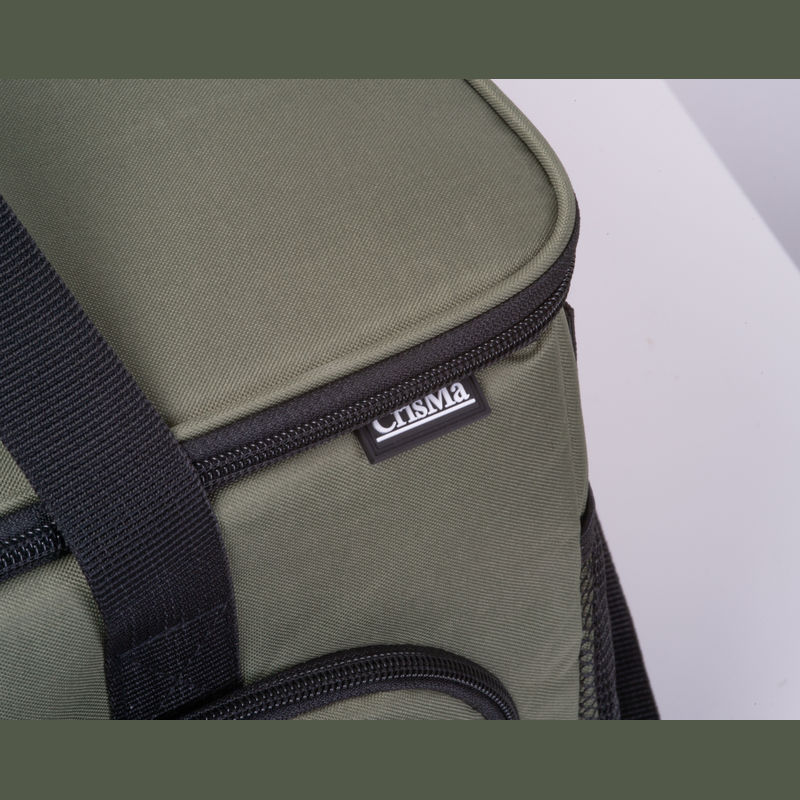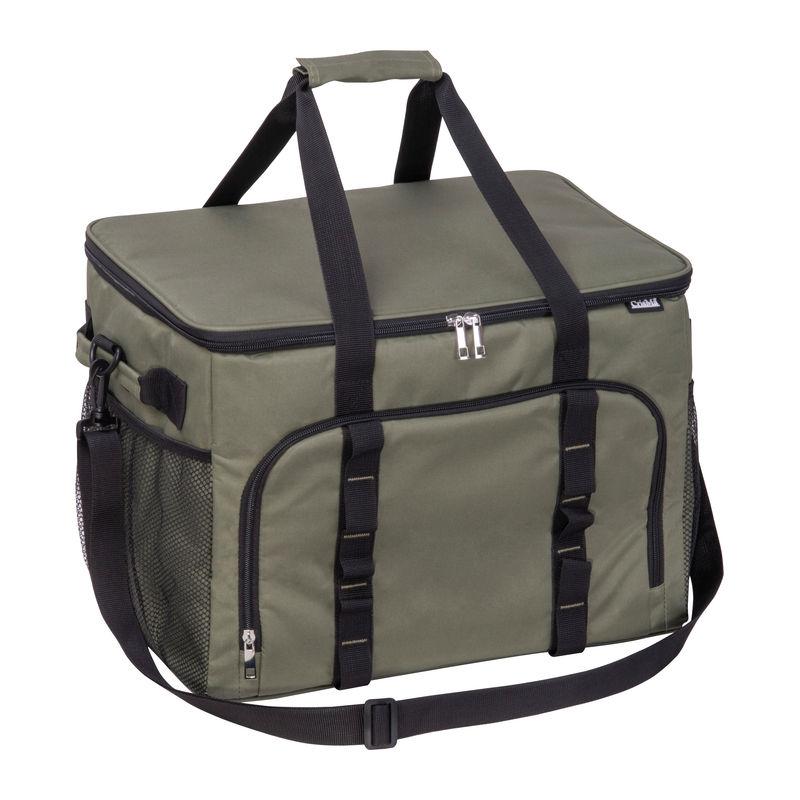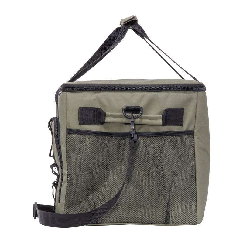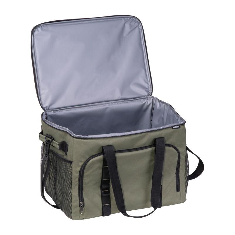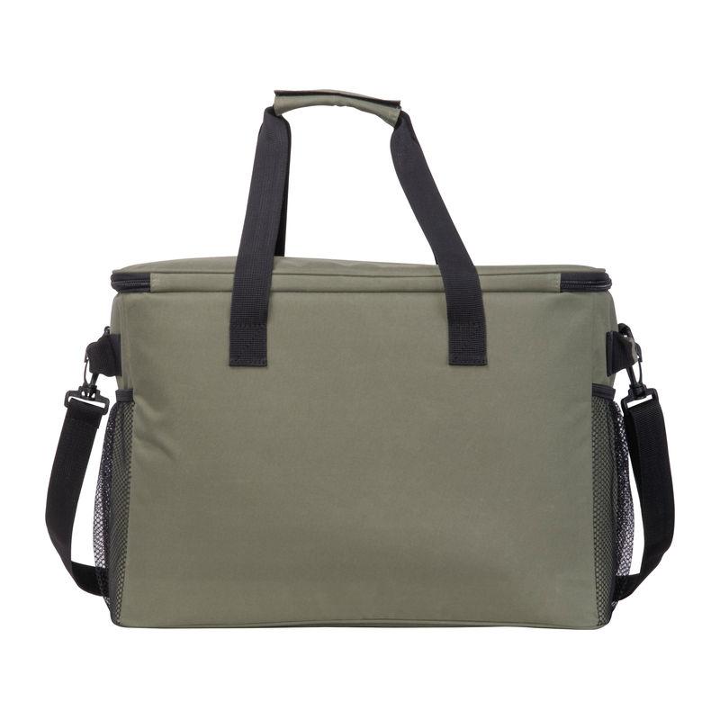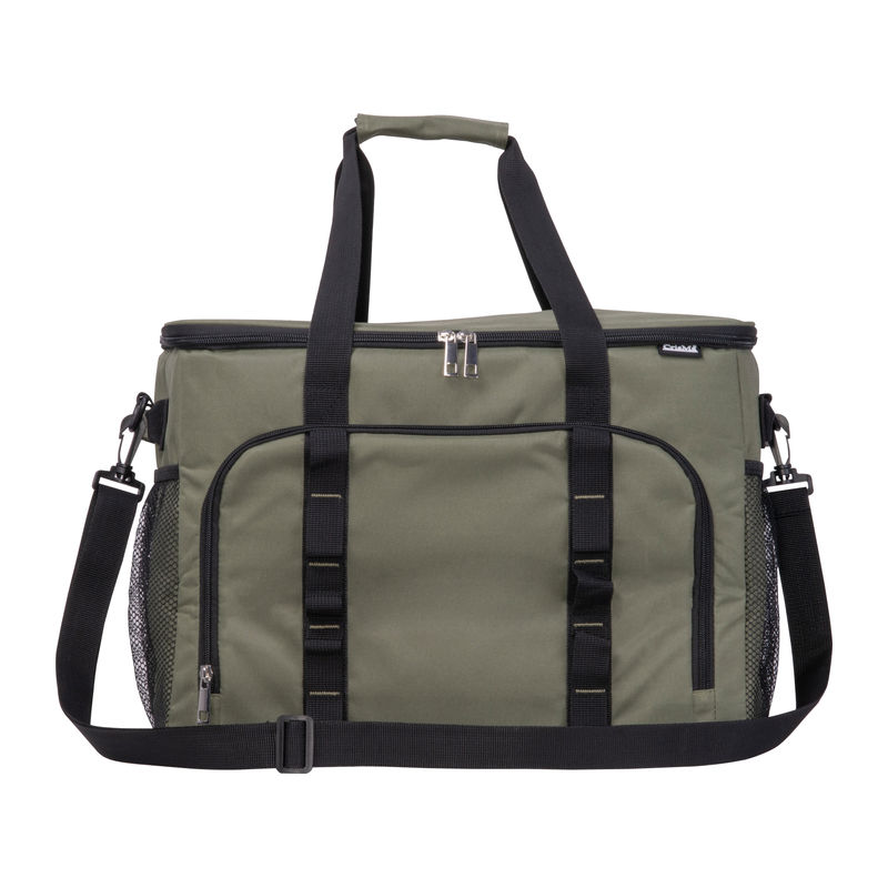 Large cooler bag, 600D polyester, 30L capacity, insulated front pocket, side mesh pockets.
