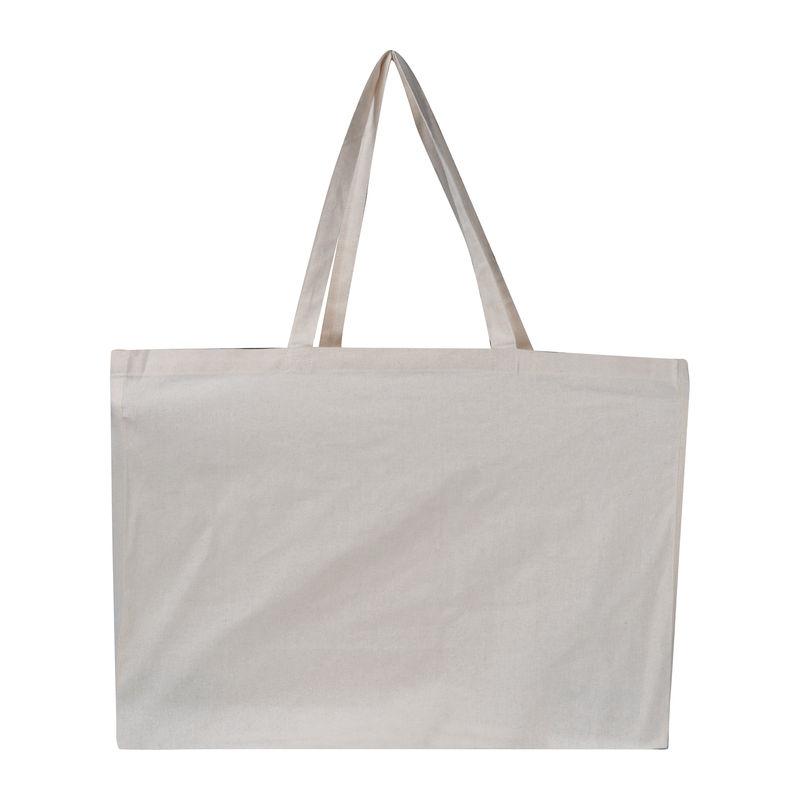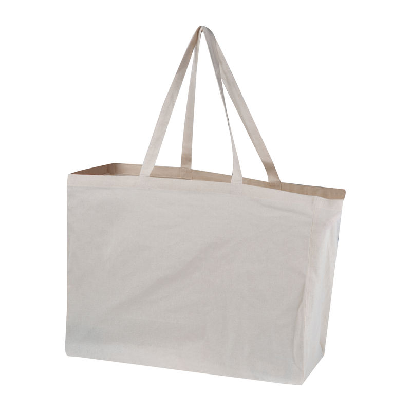 XXL shopping bag made of 140 gsm cotton, large bottom gusset and two long handles. It offers plenty of space for shopping, as a beach bag and much more. We print your logo on one side.